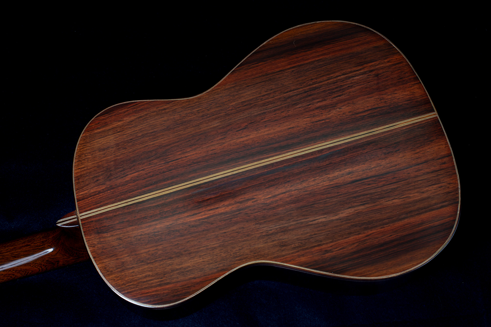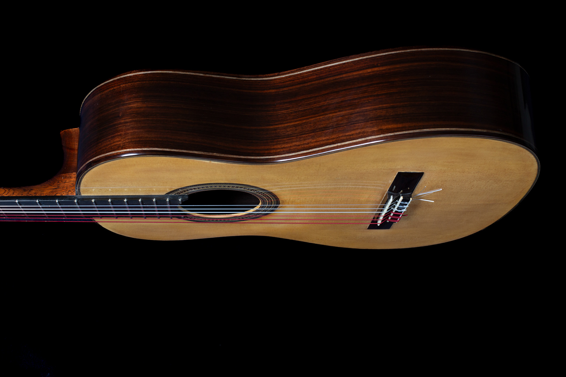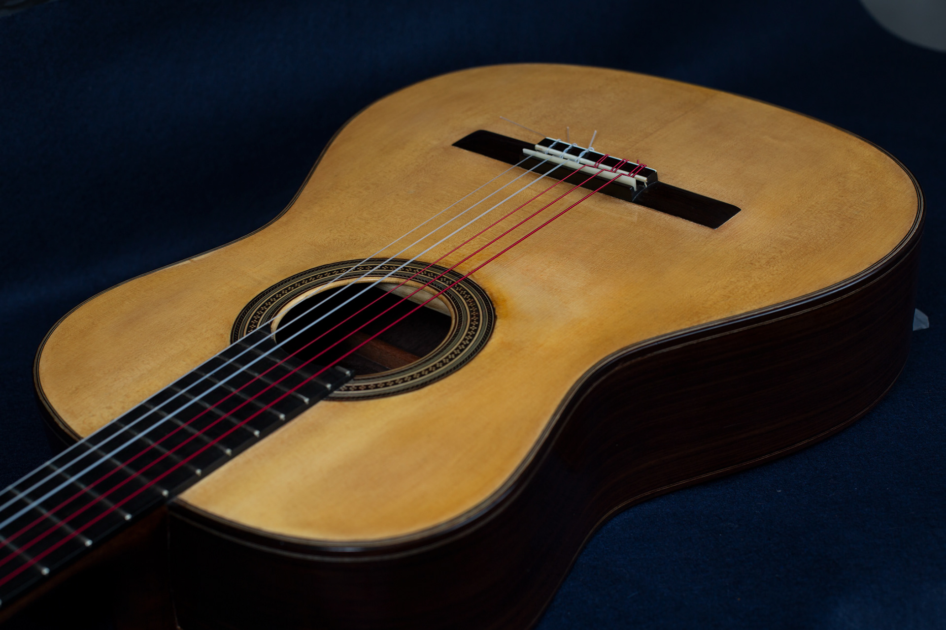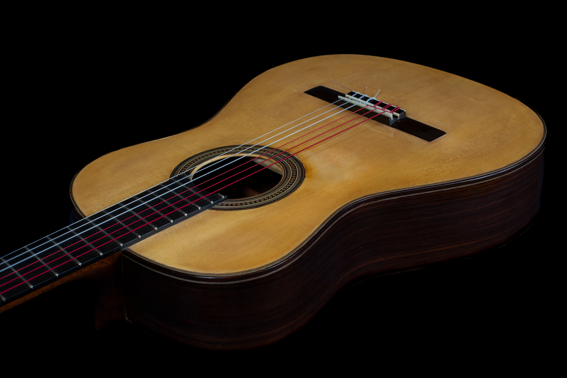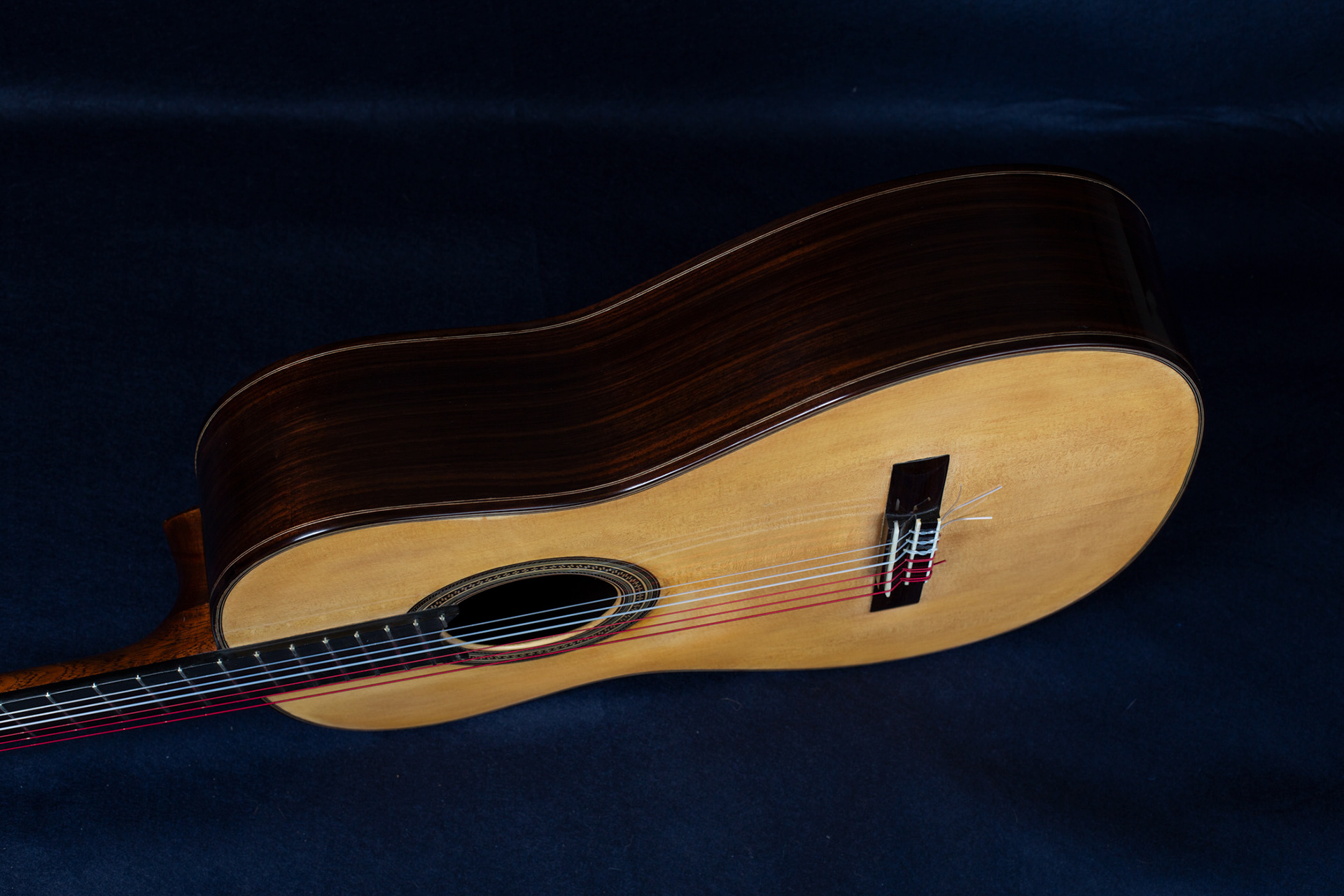 Carateristiche: ( 650 diapason, 50 al capotasto, 61 al XXII° ) Tavola armonica in Abete tedesco Fondo & fasce in Palissandro indiano. Manico in Mogano Honduras Tastiera in Ebano Gabon Meccaniche Shaller. Verniciatura a gomma lacca. Corde Aquila Sugar.